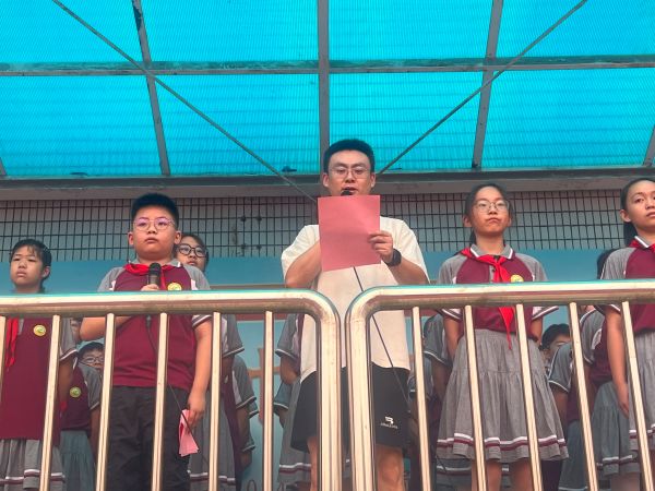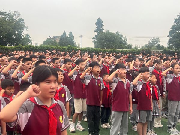 二年级的新队员代表刘萌宣代表新入队的二年级队员作表态发言。她表示:将更加严格要求自己,为班级为学校贡献自己的力量。在大队长许晨倩的带领下,全体队员们高举右拳,庄严宣誓。一句句坚定有力的誓言,是他们成为一名少先队员的担当与承诺。他们将牢记誓言,在日常学习生活中,时刻以少先队员的标准要求自己,争做新时代好少年。大队辅导员许金红老师带领队员呼号,铿锵有力的呼号声在校园上空久久回荡。