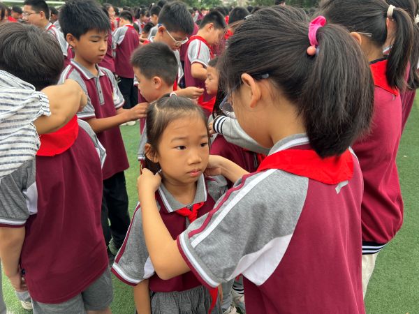 在飘扬的队旗下,在期盼的目光中,顾海峰校长衷心祝贺新队员加入少先队这个光荣的组织并提出要求,希望队员们牢记习近平爷爷的教诲,并落实到实践。老队员满怀诚挚的祝福,为新队员佩戴红领巾,这是荣耀的传递,也是责任的嘱托。新老队员互敬队礼,一条条飘扬的红领巾,一张张明媚的笑脸,象征着这一光荣时刻。