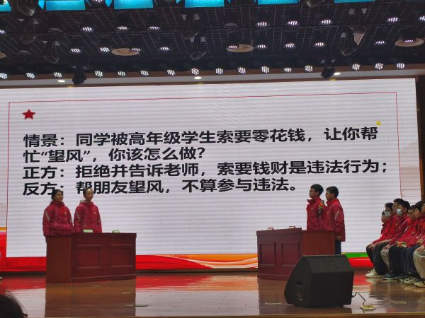 进入“明辨是非——法治是行为的‘指南针’”板块,一场主题为“同学被高年级学生索要零花钱,让你帮忙“望风”,你该怎么做?”的法治情景辩论赛精彩上演。正反双方辩手围绕校园生活中的两难选择展开激烈交锋,结合法治知识阐述观点,逻辑清晰、论据充分,不仅展现了队员们的思辨能力,更让大家对“正义”与“法治”的关系有了更深刻的理解。随后,队员们带来的快板《法治相伴,快乐成长》以轻松活泼的形式串联法治知识,清脆的节奏、朗朗上口的话语,让法治理念在潜移默化中深入人心。
