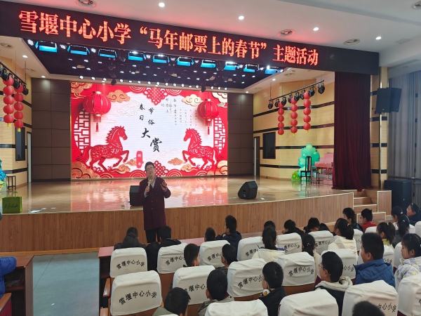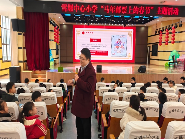 为弘扬中华优秀传统文化,增进青少年对传统民俗的认知与热爱,营造喜庆祥和的节日氛围,迎接甲午马年新春,2月2日,雪堰中心小学特邀中国邮政常州市分公司邮票历史研究员、校园特聘讲师成睿老师,开展了一场“马年邮票上的春节”主题文化讲座。
